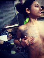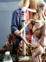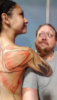 We work with a live, nude model. The instructor will move the model’s body into various positions to make muscles flex or twist, then paint directly on one half of the model’s body to make sure every student can see exactly what deeper structure is being discussed.